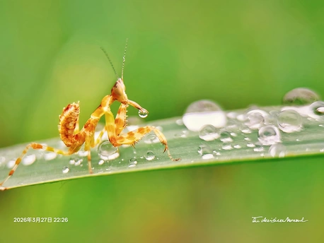 雨后的草叶上藏着mini版童话🍃 橙纹小螳螂踮着脚,鼻尖轻碰一颗透亮露珠 像捧着整个春天的星光 用手机微距定格这一瞬,连绒毛都清晰可见 清新绿调+通透水珠,是春天最温柔的滤镜 原来美好就藏在这毫厘之间的小确幸里🌱