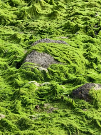 晨光漫过的海岸,把潮间带的浒苔染成了最鲜亮的绿。 那些纤细的藻丝顺着礁石的肌理铺展,像被海风揉皱的绿丝绒,又像大地悄悄蔓延的春潮,层层叠叠,柔软又蓬勃。 石头被这层绿意温柔包裹,原本粗粝的棱角都变得朦胧,仿佛海把一整个春天的生机,都织进了这一片流动的翠色里。 风过时,绿浪轻晃,连带着空气里都漫着清冽的海味与草木的鲜气,让人恍惚间以为闯入了一片藏在海边的绿野仙境。