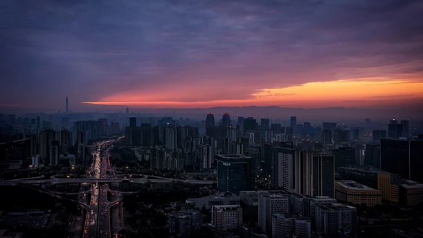 构图 采用高空俯瞰视角,将城市天际线与蜿蜒的城市道路纳入画面,形成强烈的纵深感。道路的线条引导视线向远方延伸,与错落的建筑形成动静对比,既展现了城市的宏大格局,又通过细节凸显了都市的秩序感,让画面层次分明且富有张力。 色彩 以紫蓝渐变的天空为底色,暖橙的霞光为画面增添一抹亮色,地面的暖黄车灯与冷调建筑形成冷暖碰撞。色彩过渡自然,从天空的深邃到霞光的温暖,再到城市的烟火气,层层递进,营造出既静谧又充满生机的氛围,精准捕捉了黎明时分的独特色调。 情感 画面传递出都市特有的温柔与宁静,黎明前的朦胧感消解了城市的喧嚣,暖调霞光与车灯交织出治愈感。既让人感受到都市生活的秩序与节奏,又能在光影中找到片刻的松弛,唤起对城市生活的复杂共情,是忙碌与温柔的完美融合。 主题 以黎明时分的城市为主题,记录了都市从沉睡中苏醒的瞬间。通过天空、建筑、道路的联动,展现城市的多元面貌——既有宏大的城市格局,又有细腻的生活烟火,用画面诉说着都市的日常与变迁,是对城市生命力的生动诠释。 艺术价值 将城市风光升华为艺术表达,用光影与色彩定格黎明的诗意。构图的秩序感与色彩的氛围感结合,让日常的城市景观拥有独特的艺术张力。
