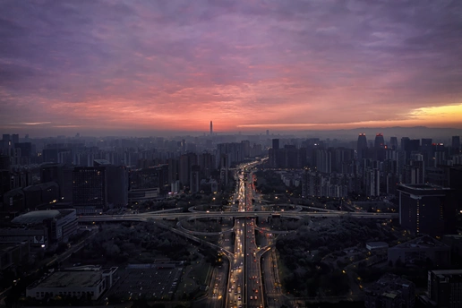 构图 采用高空俯视视角,将城市立交与天际线纳入画面,形成强烈的纵深感。道路的线条引导视线向远方延伸,与错落的建筑形成动静对比,既展现了城市的宏大格局,又通过细节凸显了都市的秩序感,让画面层次分明且富有张力。 色彩 以紫粉渐变的天空为底色,暖橙的霞光为画面增添一抹亮色,地面的暖黄车灯与冷调建筑形成冷暖碰撞。色彩过渡自然,从天空的深邃到霞光的温暖,再到城市的烟火气,层层递进,营造出既静谧又充满生机的氛围,精准捕捉了黄昏时分的独特色调。 情感 画面传递出都市特有的温柔与忙碌,黄昏的朦胧感为城市蒙上浪漫滤镜,暖调霞光与车灯交织出治愈感。既让人感受到都市生活的秩序与节奏,又能在光影中找到片刻的松弛,唤起对城市生活的复杂共情,是忙碌与温柔的完美融合。 主题 以黄昏时分的城市为主题,记录了都市从喧嚣到静谧的过渡瞬间。通过天空、建筑、道路的联动,展现城市的多元面貌——既有宏大的城市格局,又有细腻的生活烟火,用画面诉说着都市的日常与变迁,是对城市生命力的生动诠释。 艺术价值 将城市风光升华为艺术表达,用光影与色彩定格黄昏的诗意。构图的秩序感与色彩的氛围感结合,让日常的城市景观拥有了独特的艺术张力。