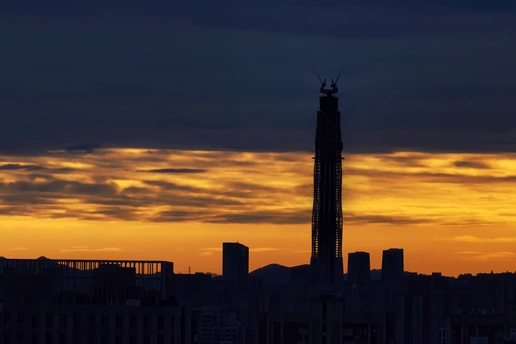 构图:采用对称式构图,将在建高楼置于画面中心,两侧低矮建筑形成自然的视觉引导,让主体更突出。天空与城市的上下分割,平衡了画面的重量感,同时在建高楼的线条打破了天空的单调,增添了动态感,使整个画面稳定又不失张力。 色彩:以深蓝灰的天空为底色,暖黄色的霞光横贯画面,形成强烈的冷暖对比。建筑的深黑剪影在两种色调间起到过渡作用,既凸显了霞光的明亮,又强化了建筑的轮廓。色彩层次分明,从冷到暖的渐变,精准捕捉了黄昏时分的独特氛围。 情感:画面传递出一种沉静与希望交织的情感。厚重的天空带着一丝压抑,而暖黄的霞光和在建高楼,又象征着城市的蓬勃生机。这种对比,既让人感受到都市的沉稳,又能从中读出未来的期许,唤起对城市发展的复杂共情。 主题:以“城市的成长”为主题,通过在建高楼与黄昏天空的组合,记录了城市发展的瞬间。在建的高楼是城市的新地标,黄昏则代表着一天的结束与新的开始,寓意着城市在不断建设中迈向新的阶段,是对城市生命力的生动诠释。 艺术价值:将城市建设的日常场景升华为艺术表达,用光影与色彩定格城市的成长瞬间。构图的稳定性与色彩的戏剧性结合,赋予画面独特的艺术张力。它不仅是城市风貌的记录,更是美感范本