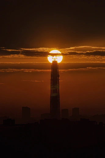 构图:采用中心对称构图,将在建高楼置于画面正中央,与后方的太阳形成完美的视觉重合。建筑的垂直线条与太阳的圆形轮廓形成强烈对比,既凸显了建筑的高耸,又让太阳成为画面的视觉焦点,这种巧合的构图极具戏剧性,瞬间抓住观者眼球。 色彩:以暖金色为主色调,从太阳的亮黄到天空的橙黄,色彩过渡自然且富有层次。建筑的深黑剪影在暖色调背景下格外醒目,形成强烈的视觉冲击。云层的金边与太阳的光辉相互映衬,为画面增添了温暖与大气的氛围,精准捕捉了黄昏时分的独特色彩。 情感:画面传递出一种震撼与敬畏交织的情感。太阳与建筑的重合奇观,让人不禁感叹自然与人类力量的碰撞。暖金色的色调带来治愈感,高耸的建筑则象征着城市的蓬勃生机。这种对比,既让人感受到自然的伟大,又能从中读出人类建设的力量,唤起对城市发展的复杂共情。 主题:以“自然与城市的对话”为主题,通过太阳与在建高楼的重合,展现了自然景观与人类建设的奇妙相遇。太阳代表着永恒的自然力量,高楼则象征着不断发展的城市文明,二者在画面中完美融合,寓意着城市在自然的包容下不断成长,是对城市与自然关系的生动诠释。 艺术价值:将日常的城市建设场景升华为艺术表达,定格罕见的重合瞬间
