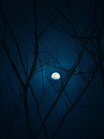 在这片深蓝的夜空下,一轮明月高悬,透过光秃秃的树枝,洒下银白的光辉。它静静地照耀着大地,仿佛在诉说着古老的故事。每一根枝桠都像是精心绘制的轮廓,勾勒出一幅静谧而深邃的夜景图。