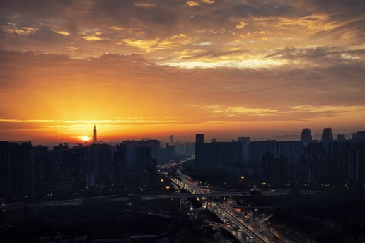 构图:采用三分构图法,将天空与城市景观巧妙分割,既突出了朝霞的壮丽,又展现了城市的繁华。交错的立交桥与远处的建筑形成丰富的层次,引导视线从近及远,让画面在开阔中不失细节,完美平衡了自然景观与都市风貌。 色彩:以暖橙色为主色调,从天空的亮黄到建筑的深黑,色彩过渡自然且富有层次。朝霞的暖光与城市的冷色调形成对比,为画面添了几分温柔与治愈。车灯的点点暖光与天空的橙黄相互映衬,让城市在黄昏中多了几分烟火气。 情感:画面传递出一种温暖与治愈交织的情感。暖橙色的天空与城市的车水马龙,既让人感受到都市的忙碌与活力,又能从中找到独属于黄昏的宁静。这种动静结合的氛围,唤起人们对城市生活的复杂共情,在忙碌中找到片刻的温柔。 主题:以“城市黄昏的温柔与力量”为主题,通过朝霞与城市景观的融合,展现了都市的多元魅力。既传递出城市建设的蓬勃生机,又藏着独属于黄昏的治愈感,让人在欣赏中读懂都市的温柔与力量,找到生活的平衡点。 艺术价值:将日常的城市景观升华为艺术表达,用光影与色彩定格了黄昏的瞬间。构图的巧思与色彩的碰撞,赋予画面独特的艺术张力。它不仅是城市风貌的记录,更通过视觉语言传递出对城市生活的思考。