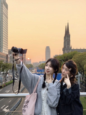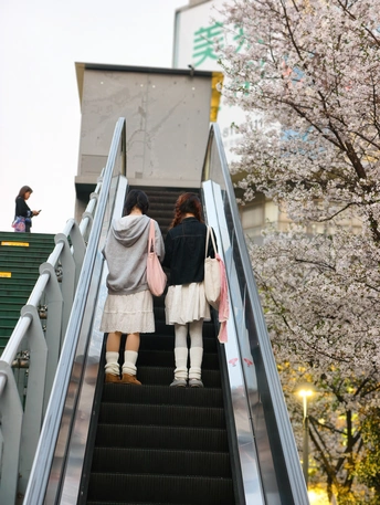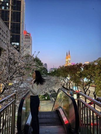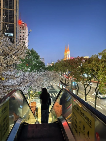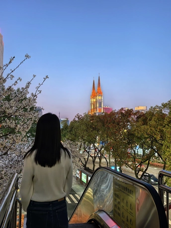 橘色黄昏,樱花、扶梯与闺蜜。 天桥落日,繁花满枝,教堂灯火, 定格春日里的温柔瞬间。