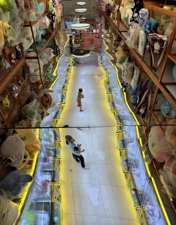 天花板是一面巨大的镜子,把满室软萌的玩偶、奔跑的小身影,都复刻成了另一个平行时空。 在这里,快乐是双倍的:一边是触手可及的玩偶海洋,一边是镜像里无限延伸的童年梦境。 原来抓娃娃的快乐,从来不止于抓到的瞬间,更是闯入这片被温柔包裹的、属于孩子的乌托邦。