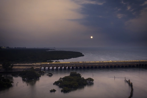 构图:采用三分构图法,将水面、长桥与天空分层铺展,长桥的横向线条延伸至远方,引导视线深入画面,既平衡了水面的开阔与天空的厚重,又通过水中红树林的点缀,让画面在简洁中不失细节,尽显静谧悠远的意境。 色彩:整体色调偏冷,灰蓝的天空与暗绿的红树林形成沉稳基底,天边的暖黄光晕与长桥的黄色栏杆成为视觉亮点,冷暖对比间为画面注入一丝温柔。低饱和的色彩搭配,精准烘托出早晨的朦胧与沉静,氛围感拉满。 情感:画面传递出极致的宁静与治愈感。水面、长桥与红树林,仿佛将时间都慢了下来,让人在欣赏中忘却喧嚣。天边的太阳更添几分诗意,唤起内心深处对自然的亲近感,于静谧中找到心灵的归处。 主题:以“自然与人文共生”为主题,长桥作为人文印记,与红树林、水面等自然景观完美融合,展现出人类建设与自然生态的和谐共处。蓝色为这份共生添上温柔滤镜,传递出对自然平衡之美的赞颂。 艺术价值:用长曝光技法将水面拍得如镜面般柔和,结合低饱和色彩与极简构图,把日常的水岸风景升华为富有诗意的艺术作品。它以静谧的视觉语言,引发观者对自然与人文关系的思考,兼具审美价值与精神共鸣。