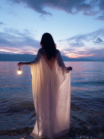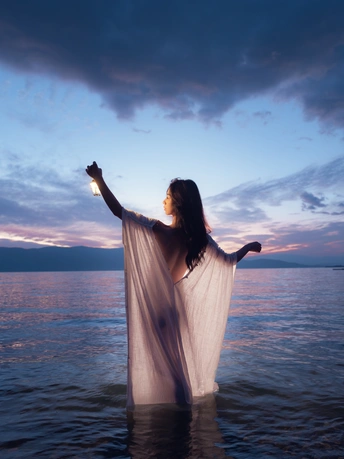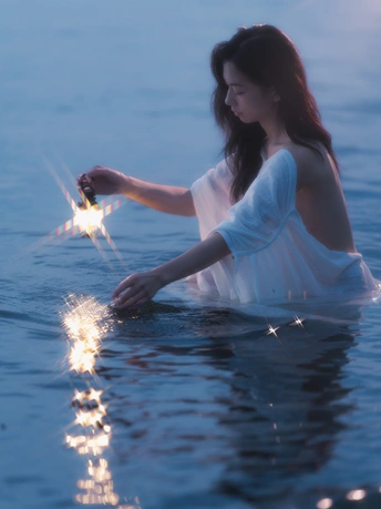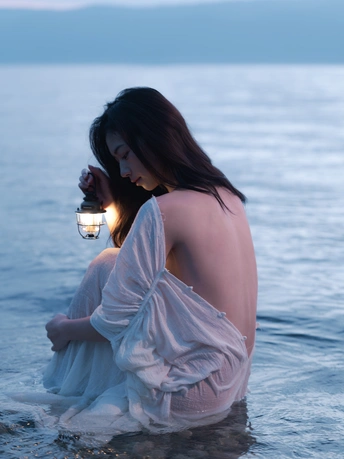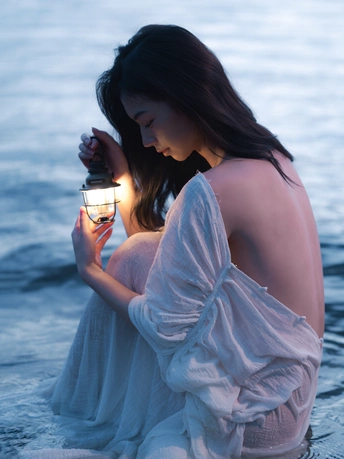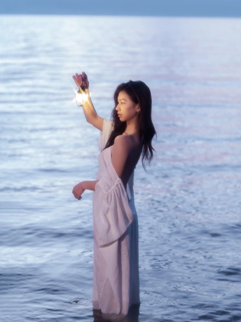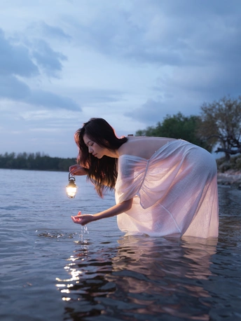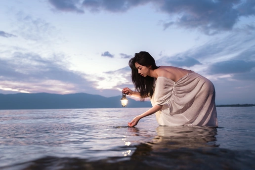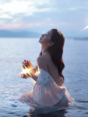 暮色四合时,洱海化作一块巨大的调色盘,将天空的粉紫与湖水的靛蓝揉成温柔的渐变。少女身着白色露背长裙立于浅滩,手中提灯如星子坠入人间,暖黄光晕在粼粼波光里碎成点点金箔。她时而仰头凝望云霞,时而俯身轻触水面,发丝随晚风拂过肩头,裙摆被浪花浸湿后更显轻盈,仿佛下一秒就要化作水雾融入这暮色。提灯的光与天际的霞光交织,将身影勾勒得朦胧又清晰,像是从童话里走出的精灵,在洱海的怀抱里,与暮色共舞,与星光私语。这一刻,时间仿佛静止,只剩海浪轻拍岸边的声音,和提灯里藏着的,关于温柔与自由的所有想象。