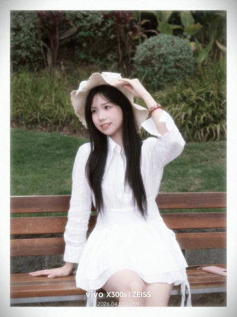画面中,一位长发女孩身着白色连衣裙,头戴米色草帽,坐在木质长椅上,背景是郁郁葱葱的绿植。整体氛围清新自然,充满夏日气息。