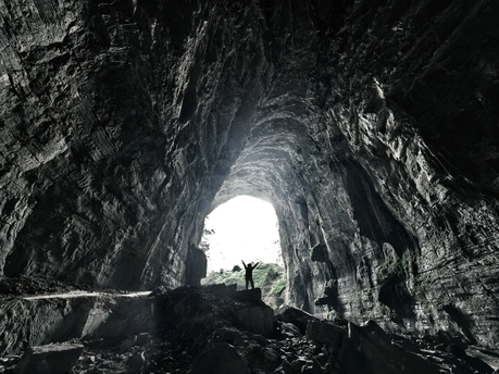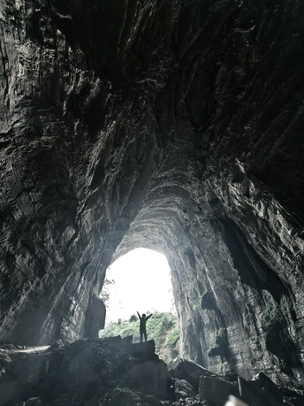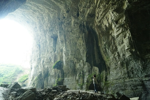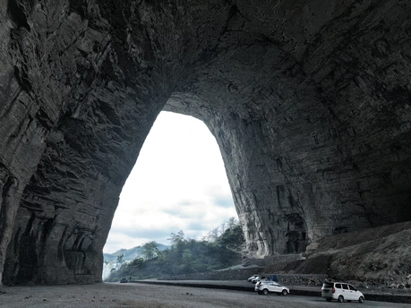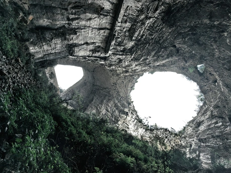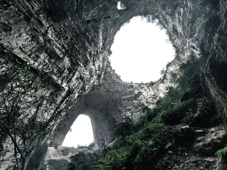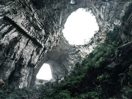 贵州省毕节市大方县清虚洞是一座山体巨大的溶洞,由天生桥、天窗洞、溶洞组成喀斯特景观。1998年,美国洞穴基金会、贵州师范大学地理系组成联合考察队,对该洞进行实地测量,该洞桥高178.25米,跨高105.25米,拱桥跨度最大处127.35米,最小处77.69米,桥身长400米,宽200米。拍到打卡理想之地。