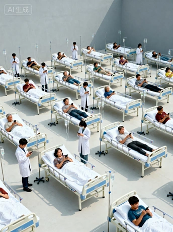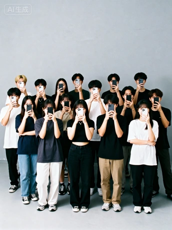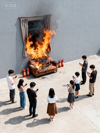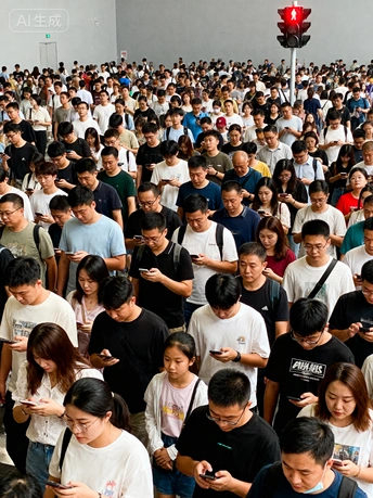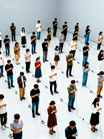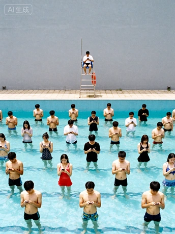《庄子·外物》有云:“泉涸,鱼相与处于陆,相呴以湿,相濡以沫,不如相忘于江湖。” 古人以“泉涸之鱼”比喻身处困境的生命,唯有以微薄的湿气相互滋润、以唾沫相互沾湿,方能维系生存。这份在绝境中迸发的情感连接,是生命最本真的渴望与力量。而今,我们正置身于一场数字时代的“泉涸”之中。 《泉涸之鱼》作品通过文字描述生成AI图像,但并非对ai技术的挽歌,而是一面映照现实的镜子,是对当代困境的视觉隐喻。我们并未身处无水的荒漠,却沉溺于指尖方寸屏幕所汇成的数字洪流,我们从未如此“互联”,却在本应最亲密无间的时刻,陷入前所未有的孤岛。当我们贪婪地吮吸着虚拟世界的“湿气”时,是否正任由现实关系中最后的情感之水悄然干涸?