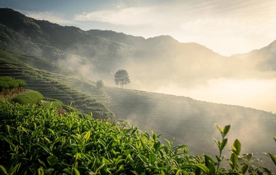 静谧的茶园山谷,晨雾让这道风景充满了意境色彩。