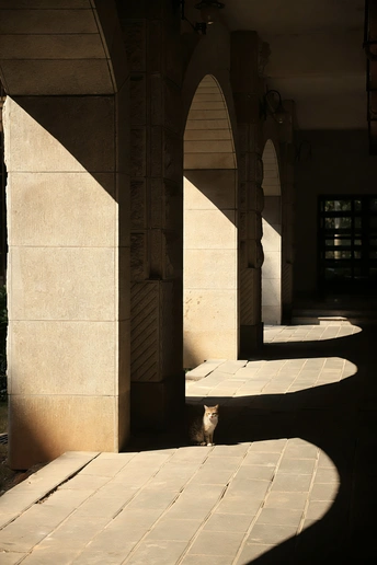 集大的拱廊里,阳光把时光切成了温柔的形状。 一只橘猫恰好停在明暗交界,抬头撞进镜头,成了校园里最治愈的瞬间。 色彩 整幅画面以暖调米黄为基底,石质廊柱在日光下晕出温润的金棕,阴影处则沉为深褐,明暗间形成柔和的层次过渡。猫咪的橘白毛发是画面唯一的鲜活亮色,在素净的石色里跳脱出来,既不突兀,又瞬间点亮了整个空间,让冷硬的建筑多了几分软萌的温度。 光影 午后阳光斜穿拱廊,在地面切割出圆润的弧形光斑,明暗交界线如刀刻般利落。亮区是暖融融的日光,暗区是静谧的廊下阴影,猫咪恰好停驻在光影的边界,一半浸在暖光里,一半藏在幽暗中,让光影成为天然的画框,将焦点牢牢锁在它身上。 构图 以重复的拱廊形成纵深透视,引导视线向画面深处延伸,猫咪被安置在前景的视觉落点,一静一动、一虚一实,让空间感与故事感兼具。 后期 强化了光影的明暗对比,保留了石材的原生质感,压低了多余色彩,让暖调更纯粹,突出了光影的层次与猫咪的灵动。 情感表达 古老的廊柱、流动的光影、偶然闯入的猫咪,在这一刻定格成温柔的瞬间。时光在拱廊间缓缓流淌,而这只小生灵的出现,让冰冷的建筑有了烟火气。