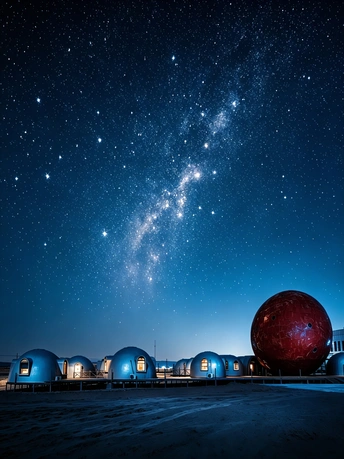 当银河倾泻在大西北的旷野,红星营地便成了地球与宇宙的交界。 深邃的夜空铺展成无垠的蓝,璀璨星河如碎钻倾泻,银带横贯天际,每一颗星都在旷野的风里闪烁。蓝白色的圆顶小屋亮着暖黄的灯,像遗落在沙地上的星球,右侧的巨型红球如火星降临,在星空下撞出科幻与浪漫的碰撞。 冷调的夜空与暖调的灯火形成温柔对冲,沙海的肌理在夜色里泛着微光,将天地的辽阔与营地的烟火气完美融合。镜头以仰拍视角拉满纵深感,让银河的浩瀚与营地的静谧形成强烈对比,每一帧都像科幻电影里的场景。 在大西北的旷野里,以沙为床,以星为被,在红星营地,赴一场跨越星河的浪漫之约,把宇宙的浪漫,都藏进这一夜的梦里。 色彩:以深邃钴蓝为底,银河银白如星河倾泻,暖黄窗灯在冷调中晕开温柔,赤红球体撞色点睛,冷暖交织,层次分明。 光影:暗夜为幕,星光为笔,银河的璀璨与地景的暖光形成明暗对冲,既勾勒出沙漠的辽阔,又点亮了营地的烟火气。 构图:银河纵贯画面,营地沿地平线铺展,红球作为视觉锚点,平衡天地,纵深感拉满。 后期:强化星空细节,校准冷暖平衡,让银河更通透,地景更立体,氛围感拉满。 情感表达:以星空为被,以沙漠为床,在天地间赴一场银河之约。