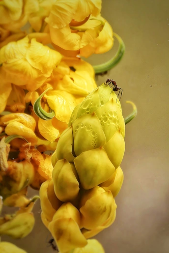 晨光吻过金苞,晨露凝在瓣尖,一只蚂蚁爬上了翅荚决明花苞的顶端。这颗花苞是它的山,这滴晨露是它的海,这方寸之间,便是它穷尽一生奔赴的天地