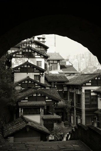 漫步重庆东水门城墙,墙体早已斑驳风化,岁月的痕迹深深镌刻在每一寸砖石之上,历经风雨冲刷,却依旧气势犹存,默默矗立在山城之中,诉说着这座城市绵延不绝的旧事。透过斑驳的城墙望去,一排仿古建筑依着山势跌宕起伏,错落有致,尽显老重庆的古韵,远处则是一栋栋拔地而起的现代化高楼,古今景致在此完美交融,勾勒出重庆独有的城市风貌。 光影之间,纯黑的暗门化作天然画框,温暖金辉穿巷而入,洒在墙垣与瓦顶之上,明暗强烈对冲,光影交错间,将山城的悠悠岁月与暖阳微光,尽数刻进斑驳墙砖与层叠瓦檐里。 构图独具巧思,以城墙拱洞为镜,巧妙框住古今盛景,层叠的古建顺着山势缓缓铺展,远方的新城高楼静静相望,前后层次分明,极强的空间感里,藏满了城市变迁的故事感。 整张照片以黑白影调滤去世间喧嚣,丰富的灰阶层次,实现从纯黑到纯白的极致柔和过渡,赋予画面堪比古典油画的高级质感,沉稳又极具韵味。 一拱之隔,便是古今;一眼望去,已是千年。黑白镜头定格的,不仅是老重庆的人间烟火,更是山城沉淀的岁月沧桑,是古今对望时,独属于这座城市的温柔与厚重。