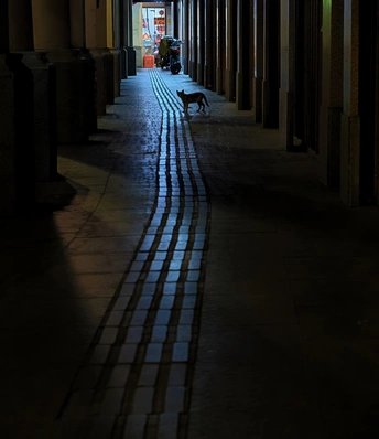 冷调光从手机店的灯箱漫出,勾勒出骑楼廊道的纵深感,一只猫咪突然闯入镜头,成为赛博夜色里最灵动的一笔。