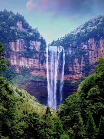 望乡台瀑布,以天地为笔,绘就这颗“天下第一心”。 丹霞为壁,飞瀑为脉,万木为衣,一汪碧泉自云端倾泻,在青山间刻出最磅礴的心动。 水流奔涌是山河的心跳,绿意漫山是自然的呼吸,站在这天地之心前,才懂什么叫一眼万年,山河壮阔。