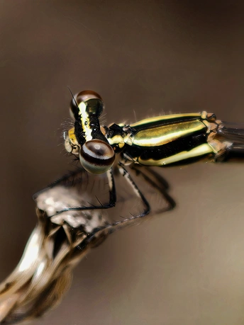 豆娘用相对于个体的巨大复眼凝视着属于它的天地。它的身体不过寸许,却呈现着大自然的匠心,我们总在追逐远方,却忘了停下脚步,去看看身边的一草一木,都藏着宇宙的秘密。这张照片,是写给微观生命的情书,也是写给我们自己的提醒:慢下来,去看见,去敬畏,每一个渺小而伟大的存在。在这方寸之间,我们看见的不仅是一只豆娘,更是自然的智慧,与生命的尊严