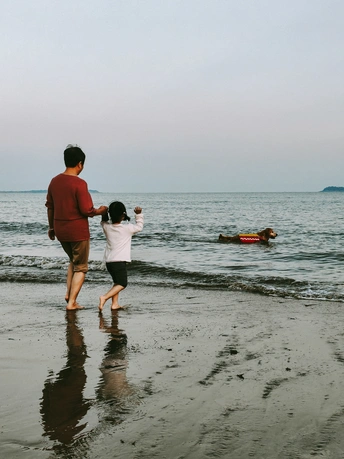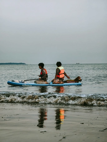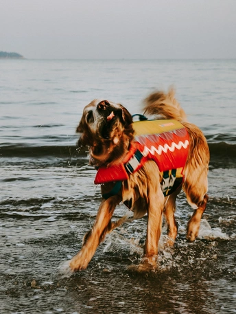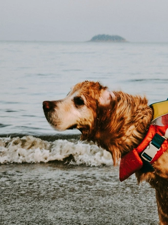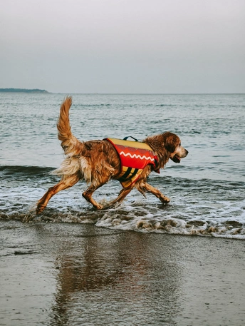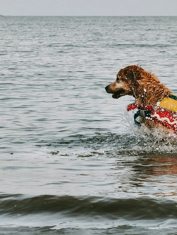 海边一只狗吸引了众人的目光。它穿着橙色救生衣,谈恋海中漂浮的感觉。在海浪中起伏久久不愿上岸。岸上往来的行人冲它招手,皮划艇手经过也摸下。直到主人一次次叫它上岸它才不情愿的上来。然后抖动毛发,送主人一身的水。