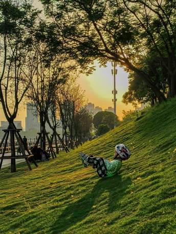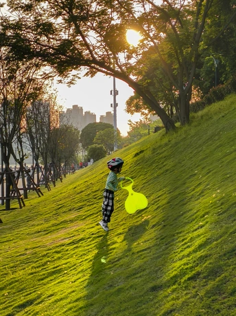 把童年的快乐,交给草地和风。 戴着头盔的小小探险家,和他的荧光绿“滑草船”,在落日里滑过一整个春天的傍晚。 阳光把影子拉得很长,笑声也跟着在风里飘远了。