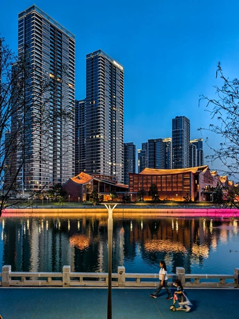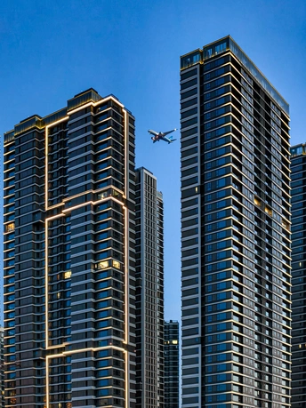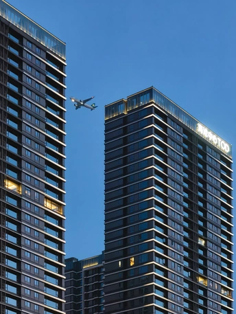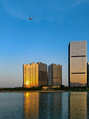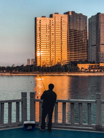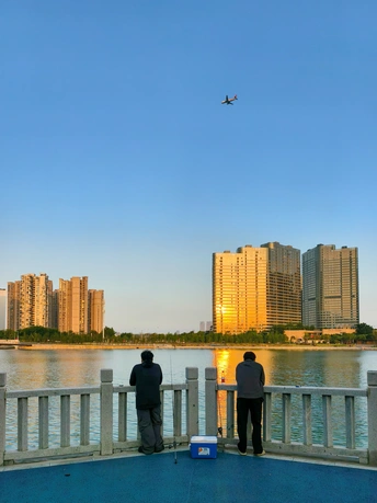 夕阳把楼群镀成暖金色,风里带着河面的潮气。鱼竿垂在水里,两人并肩靠着石栏,没说话,只看着波纹被阳光揉碎。头顶的飞机拖着淡影划过,把城市的喧嚣,都压成了慢镜头里的背景音。
