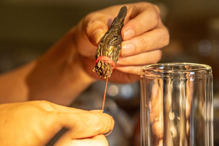 2025年9月27日,贵州省黔西南布依族苗族自治州贞丰县古城,经过两天制作后,冲泡下的坡柳嬢嬢茶在水中苏醒,如沉睡的蝴蝶,舒展翅膀,香气四溢,惊艳绽放。 贞丰县嬢嬢茶是传统名茶,特殊工艺制作形似“状元笔”,茶香浓郁。此茶又名“文笔茶”、“状元笔茶”,2019年获国家农业农村部农产品地理标志登记保护。2022年获第七届蒙顶黄茶杯全国黄茶大赛特别金奖。 坡柳嬢嬢茶特点为外形酷似毛笔头,汤色金黄透亮,香气持久幽长,滋味醇厚回甘。制作工艺可追溯至清代,传统以手工揉捻成笔头状,用红色丝绸包裹作贡茶。