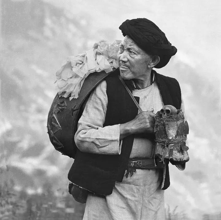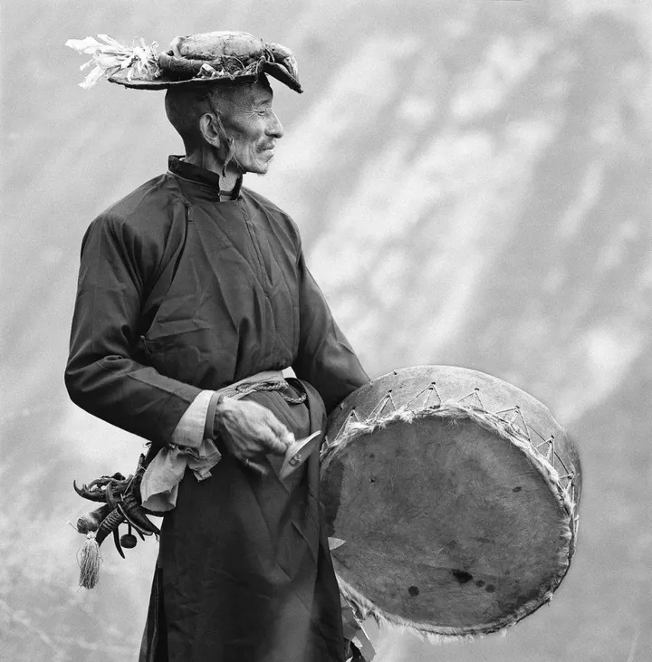 前天拿到大度十二开《十年寻羌:迁徙与回归、羌在深谷高山、最后的释比》,开卷十二个页面,六张图片静卧在哑光黑㡳之中,这里选三幅:
