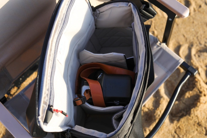 3.设计:内里加厚隔层设计,给予了机身和镜头强大的保护,让我安心出行。哪怕背包不小心掉在地上,也不怕摔坏相机镜头。