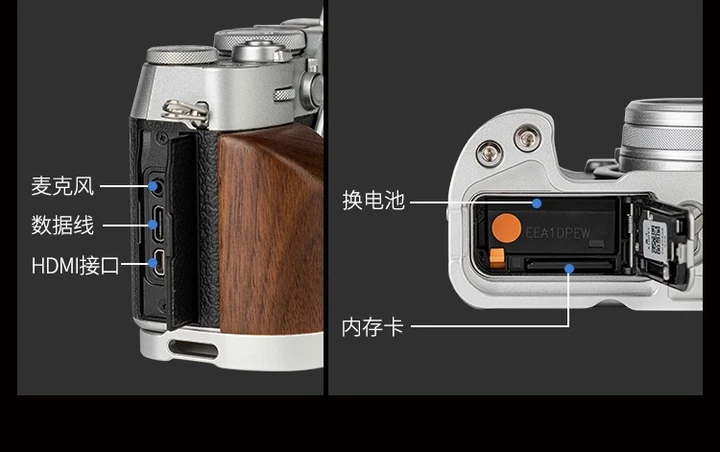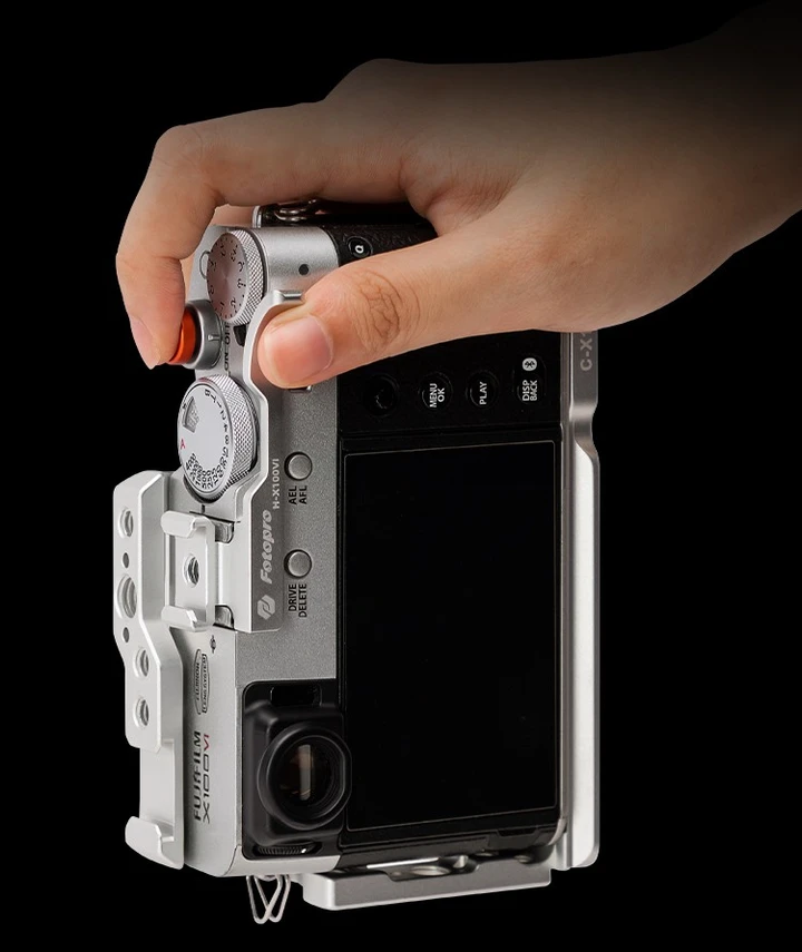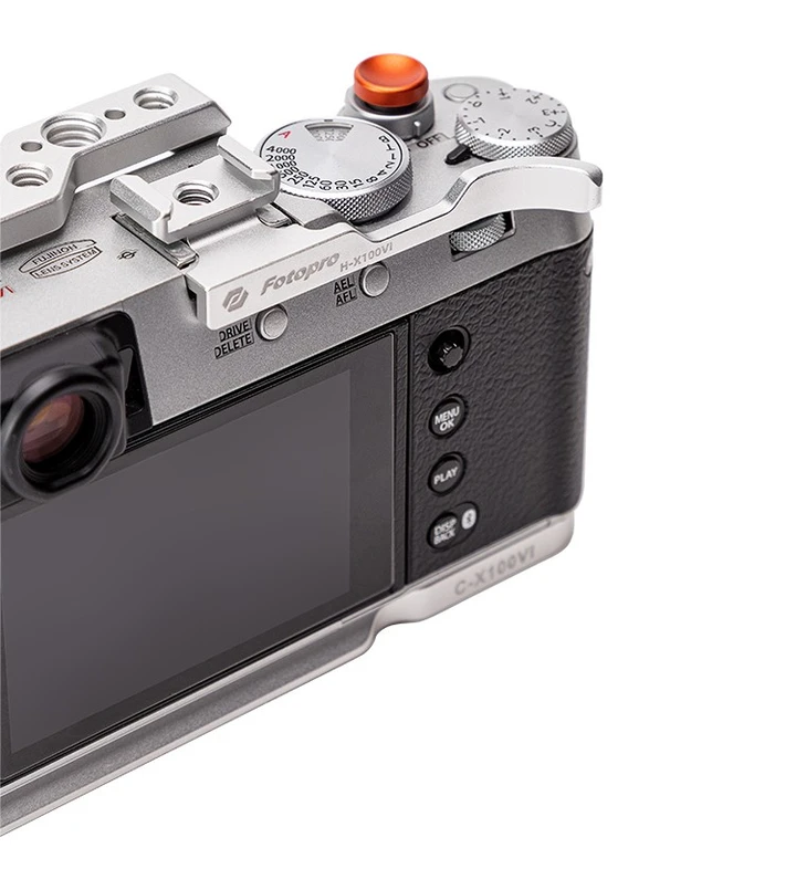 如果您还想增加操作时更细腻的手感,可搭配小宝上期推出的「流光指柄H-X100VI」哦,在单手抓握手柄时,给拇指增加了一个锁位,抓握更安全更趁手。它还附赠了个铝合金快门按钮,由于原来的快门按钮更小,垫高了它并增大面积,让触感更好,按快门更得劲。