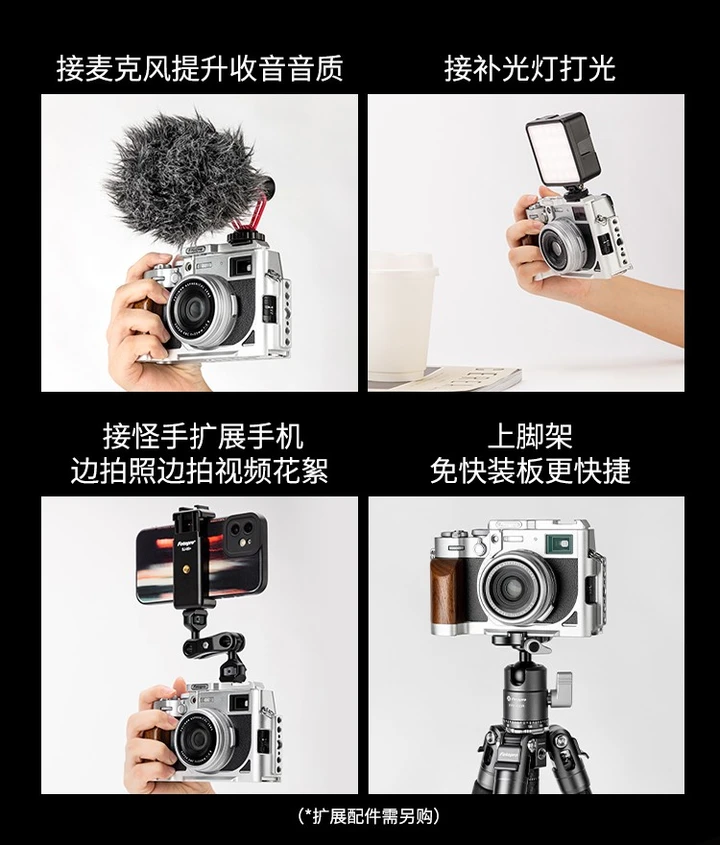 另外,为了发挥富士X100VI/V更佳性能,还能搭配麦克风提升收音音质、或者搭配补光灯打光灯,这时「流光C-X100VI」保护扩展框就帮上了大忙,它具备很多扩展孔,能同时接很多东西,实现功能最大化。