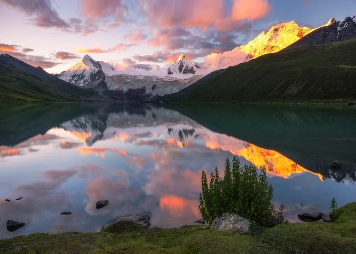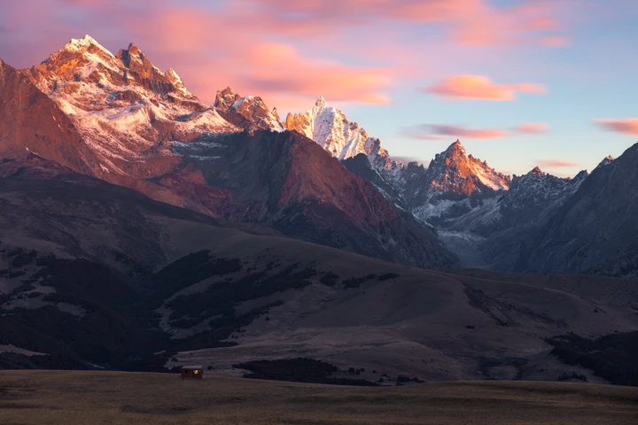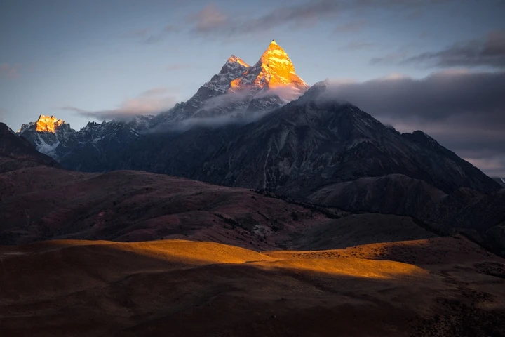 四月初,高原还没有从冬眠中苏醒,雪山笼罩着植被,格聂雪山山脉在日出时分被金红色光辉照耀,前景中有一座孤独的木屋,衬托了大自然的宏伟与宁静,其中山峰与柔和的阳光相遇,凛冽刀锋般的锯齿山形着实让人沉迷于这魔幻的场景之中。