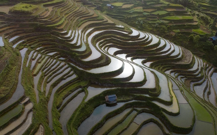 五月,我来到了贵州拍摄,上一次来是2014年春节,印象深刻当年贵州大多数年轻人都是非主流打扮,城市交通也不便利。相隔10年,处处通高速路,很多城市景区直达动车。在黔东南隐藏着一个小众梯田景区: 加榜梯田。加榜梯田依山而开,随山势地形的变化而变化,山坡海拔的高低,坡度的平缓及山坡的大小决定了梯田大小和形态,海拔高差达可千米。我升起无人机,在灌满水的梯田上拍摄了这幅毛玻璃质感的梯田风光。