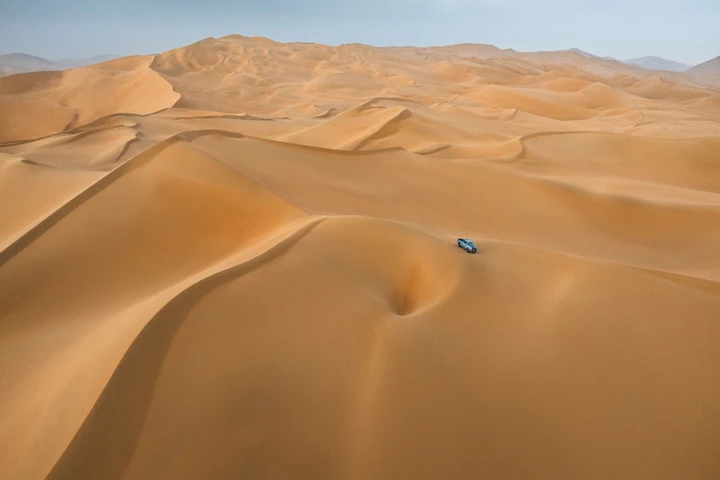 六月我来到阿拉善右旗的巴丹吉林沙漠,沙漠中有许多很高的沙墙,有多个沙漠湖泊,巴丹吉林沙漠的线条分外妖娆。单车驰骋在沙漠有一丝畏惧,穿越沙海,脚下的细腻沙粒犹如诗行,似乎在诉说着古老而神秘的故事,而穿越沙漠的人,也仿佛在倾听这些故事的呼唤。巴丹吉林既遥远又神秘,是摄影师的乐园。我升起无人机记录下我在自然里的渺小。