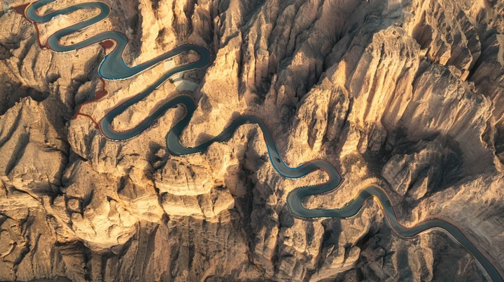 黄河石林二十二道弯,一条修在悬崖峭壁上的盘山公路。远远看去像一条卧龙盘在山腰处,甚是壮观。公路蜿蜒向远处延伸,峰林耸立直插云霄,垂直的绝壁凌空而起,造型惟妙惟肖,中国基建和大自然的鬼斧神工造就了这悬崖奇观。