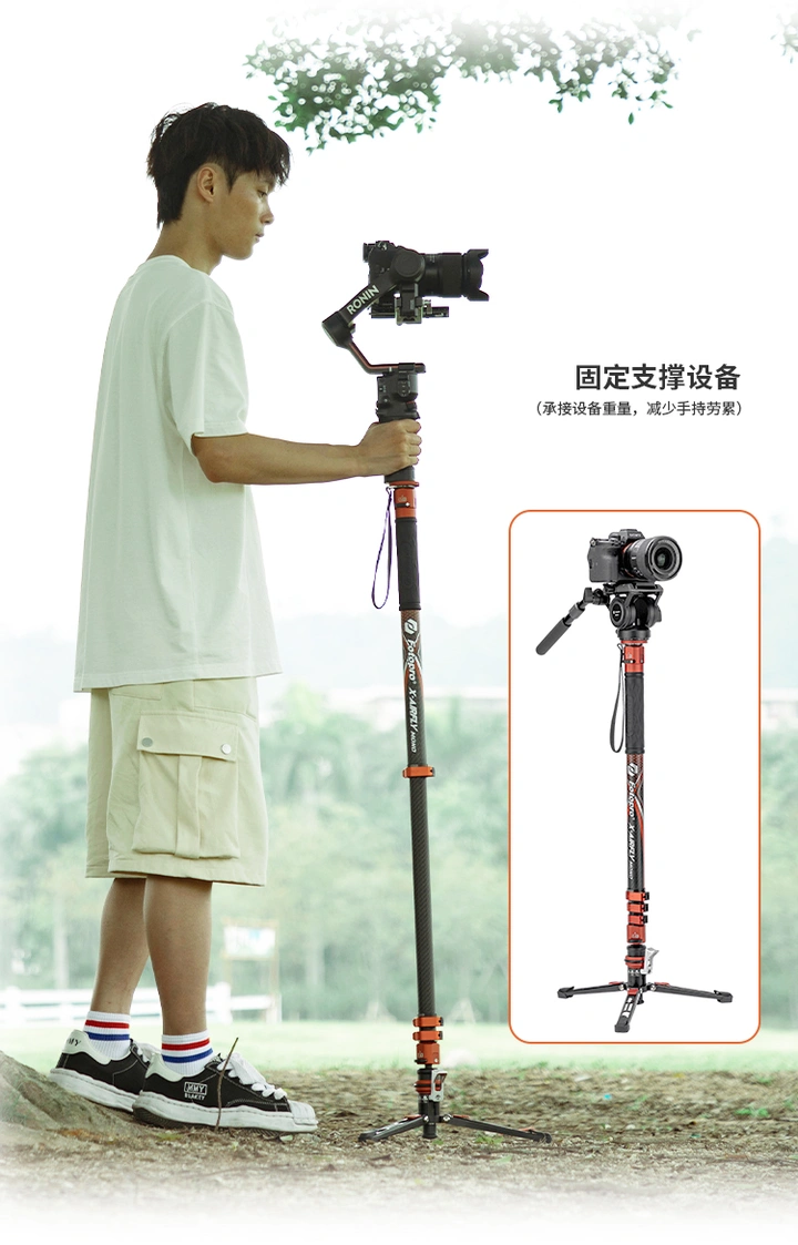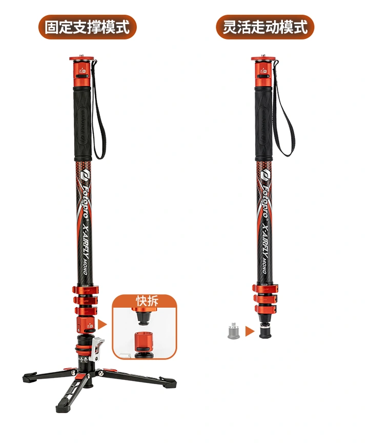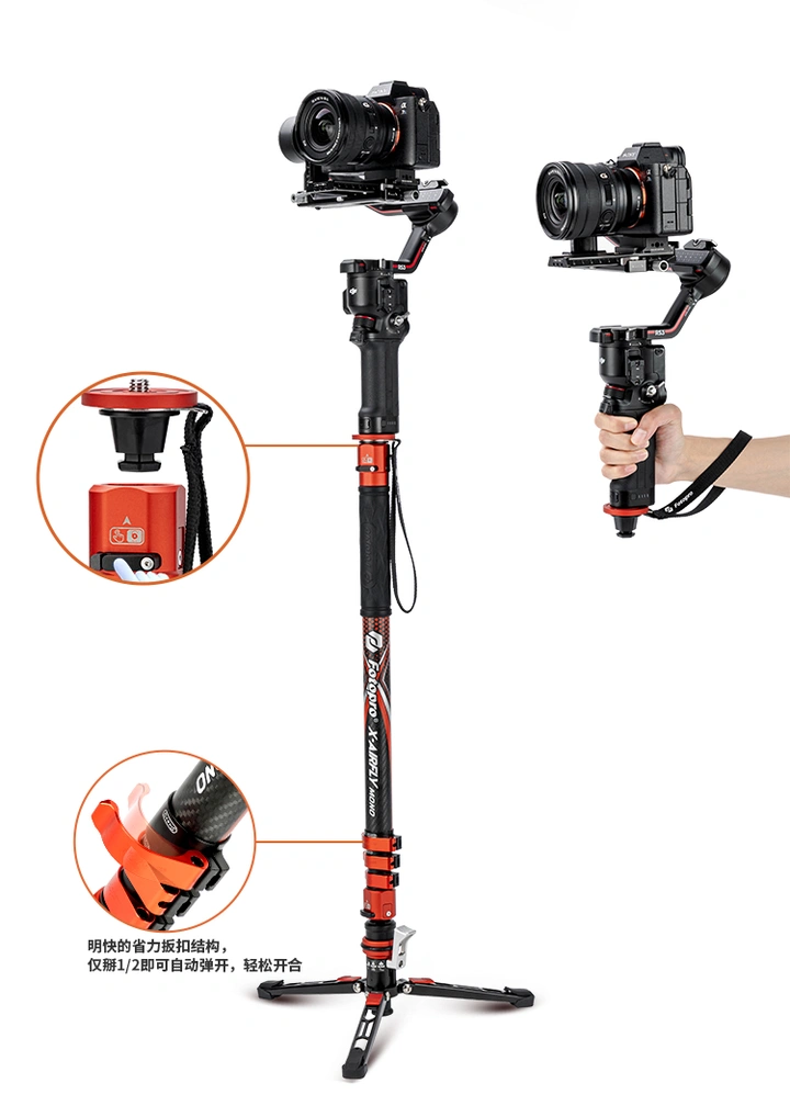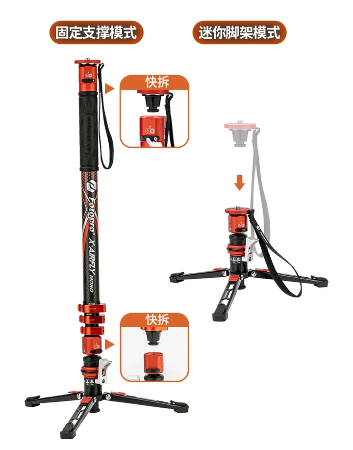 【飞行独脚架】的多功能性也是其一大亮点,除了上固定支撑模式,您还可以快速拆卸三脚撑,
