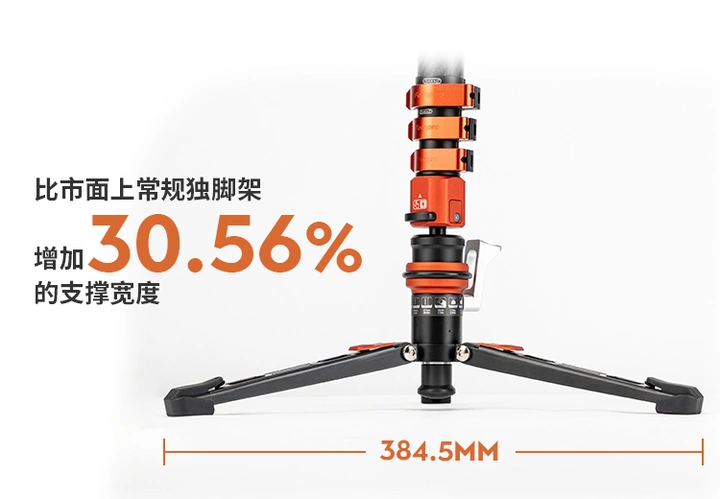一支独脚架的灵魂,在于三脚撑,【飞行独脚架】的三脚撑比市面上常规独脚架,特增加30.56%的支撑宽度,使得整体抓地力和稳定性能更强。