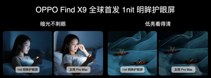 OPPO Find X9 系列全球首发 1nit 明眸护眼屏,把行业的护眼标准,推向全新高度。传统屏幕最低亮度仅能降至 2-5nit,用户在暗光环境下使用依然刺眼。为攻克这一痛点,OPPO 决定亲自下场,打造顶级护眼好屏。通过超 10 亿资金投入,OPPO 通过首创的自研屏幕双产线,构建起了从发光材料研发、高端生产制造,再到超高精度校准的全链路自主体系;并在自研 P3 屏幕显示芯片和 OPPO 芯链技术的加持下,实现了引领行业的微米级实时子像素校准,让屏幕在 1nit 极暗环境下仍能呈现极致纯净、通透的显示效果。