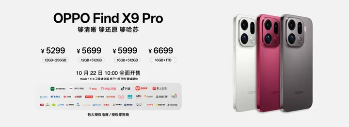作为 OPPO 30 周年巨献之作,Find X9 系列以画质革命彻底重构影像体验,用全面进化的性能、续航、护眼好屏与更流畅更智慧的系统,精准解决用户核心痛点,强势打造新一代旅拍神器。Find X9 系列 4399 元起售,10 月 22 日正式开售;Find X9 Pro 卫星通信版 11 月开售,并将率先支持 eSIM。OPPO与哈苏联合打造的哈苏专业影像套装售价 1699 元。