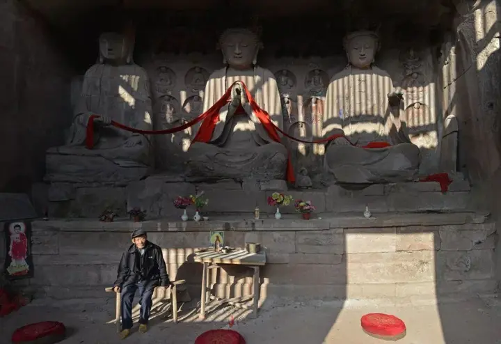 擦肩而过的僧侣、虔诚膜拜的香客、兢兢业业的文物修缮者,还有过往的村民,到此一游的旅人……佛在田间地头、佛在厨房瓦舍、佛在村边屋旁,因为有了鲜活的人的身影、情感、生活与高冷、神秘、静谧的佛链接在一起,有了“佛与众生自然融洽的生活场景”,让超脱尘世的佛也有了些许烟火气息,也多了几分生动、亲切,成为百姓日常生活的一部分。