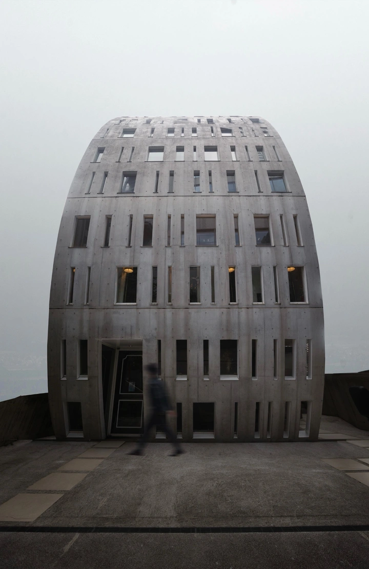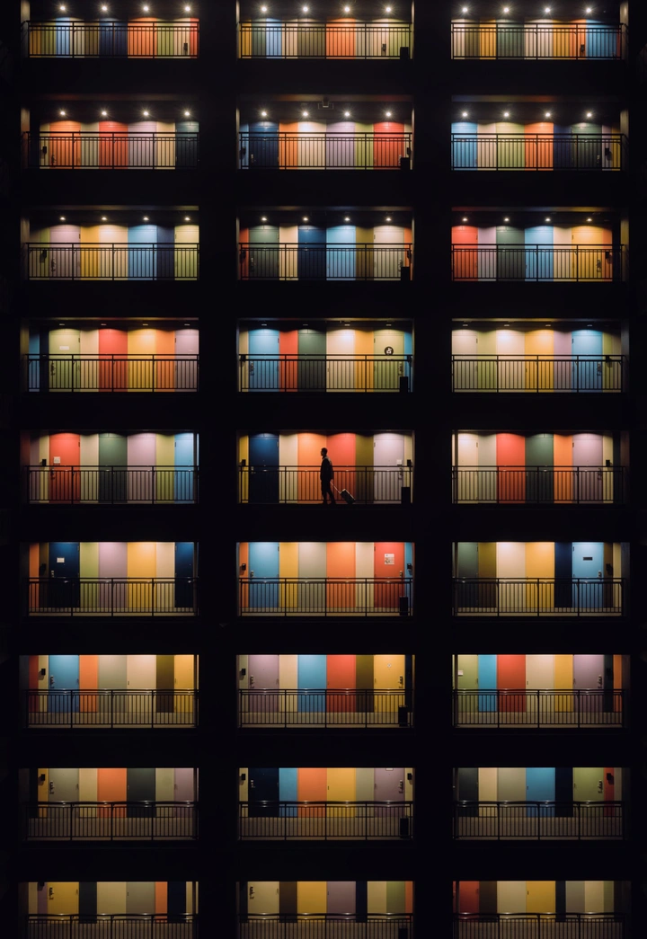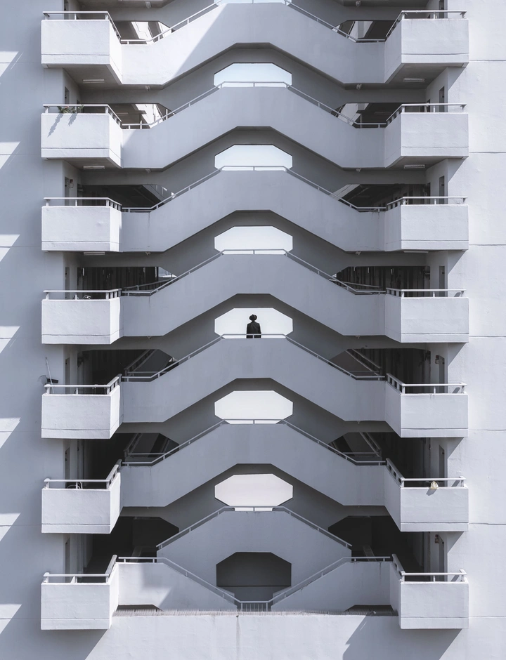 当时太阳即将落下,余晖刚好从侧面扫过建筑立面,橙色的光线像是被精确计算过一样,逐层点亮了这栋楼的结构。重复的阳台、规则的窗格,在光影的切割下产生了强烈的节奏感,而中间那位恰好出现在阳台上的人物,则让整座建筑从‘结构’变成了‘场景’。