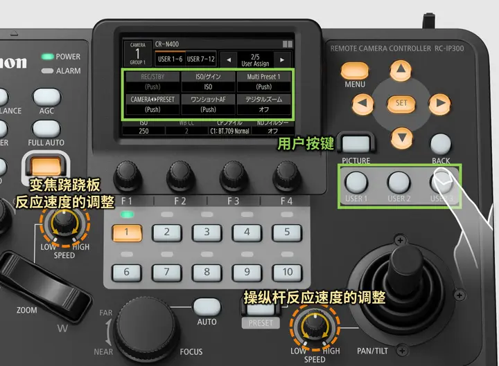 在操作方面,RC-IP300的操作区域布局合理,配备大量可直观操作的按键与旋钮,并按功能类别分区布局。其中“摄像机设置区域”配有3个可调整画质的按键;“镜头变焦控制区域”配有变焦跷跷板和光圈调节旋钮; “菜单操作区域”集成了上下左右/设置/返回按键和3个用户自定义按键;“云台控制区”配有水平/俯仰操控杆。该设计使得云台的水平/俯仰操控、变焦、对焦、光圈调节等控制都变得更便捷。此外,用户可将常用功能分配给触摸屏上的“用户设置A(User Set A)”6个功能(含3个物理按键)和“用户设置B(User Set B)”6个功能键,共计最多12个功能,通过简单的按按键操作即可快速执行所需功能。