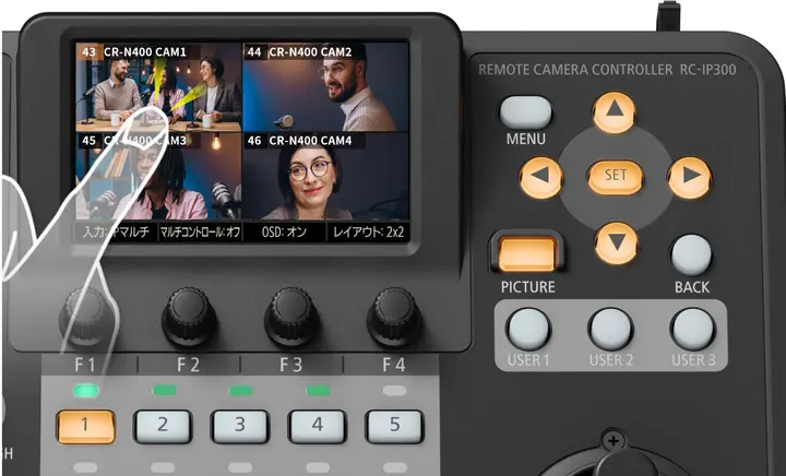 佳能RC-IP300配备3.5英寸触摸屏,可显示通过IP输入的影像内容,该控制器最多可同时显示9台摄像机画面。只需轻触触摸屏上的人物面部等位置,即可设定为自动对焦目标,还可同时显示3个裁切框,并在观看画面的同时可以直接调整各裁切框的位置与大小*5。在操作菜单方面,除了传统的翻页式菜单选择以外,还支持一览所有项目的索引列表显示,可直接从列表中选择需要设置的项目。