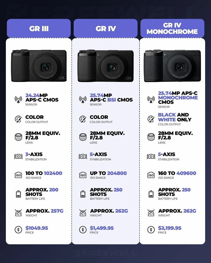 GR III适合日常记录与入门街拍:GR IV在防抖和高感上的提升,更适合夜拍与复杂光线。而Monochrome版则面向更纯粹的创作者--黑白直出强调结构光影与情绪,适合做长期主题创作。