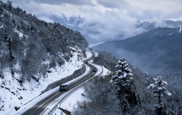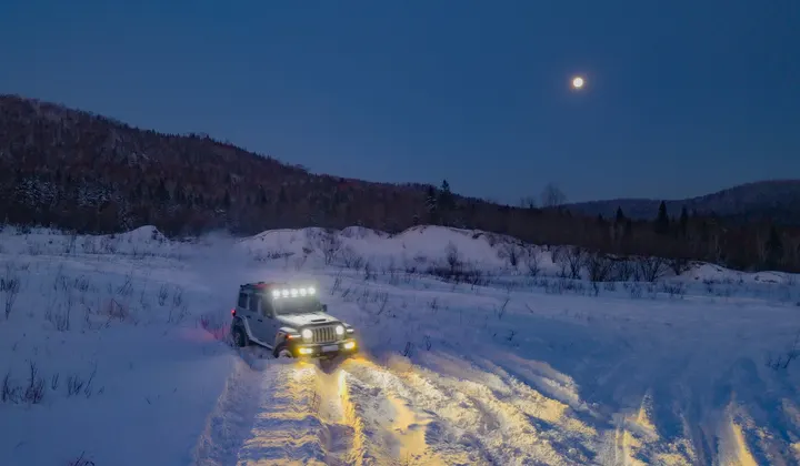 越野车划破黑龙江牡丹江的雪夜,月光为这片林海加冕。