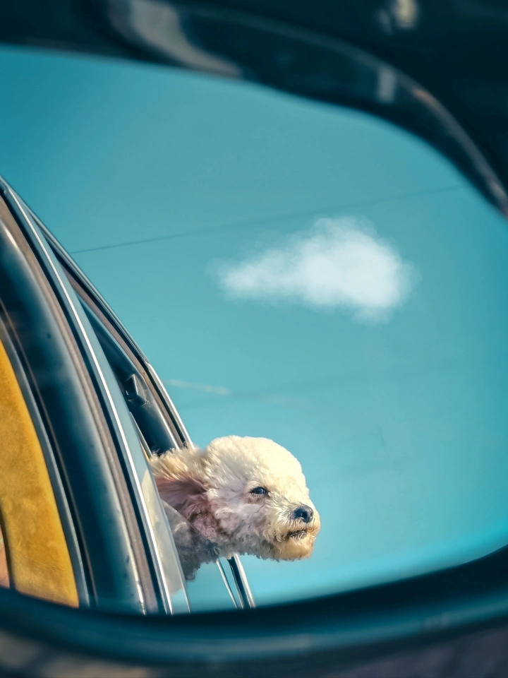 蓝天是老家的底色,小云像提前飘去的祝福,小狗把脑袋塞出车窗外,风里全是回家过年的味儿,它也跟着兴奋得毛都飞起来啦。
