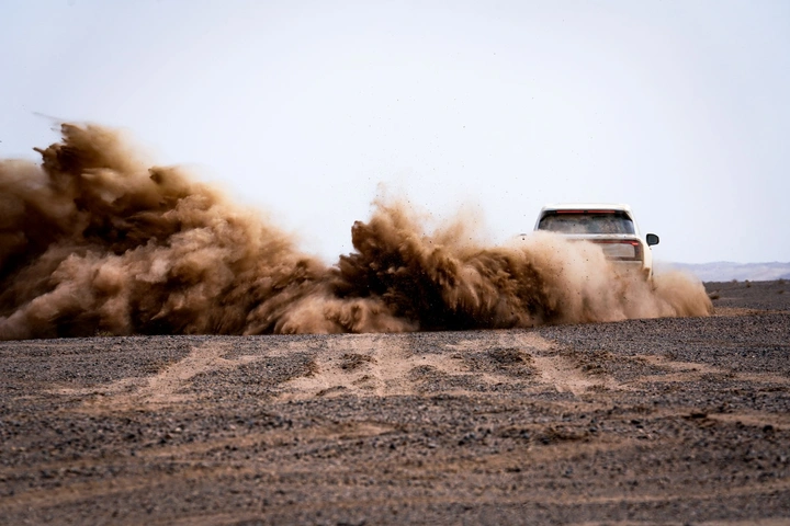 极氪9X在戈壁滩上极限漂移测试,强大的动力瞬间卷起大量的沙石。