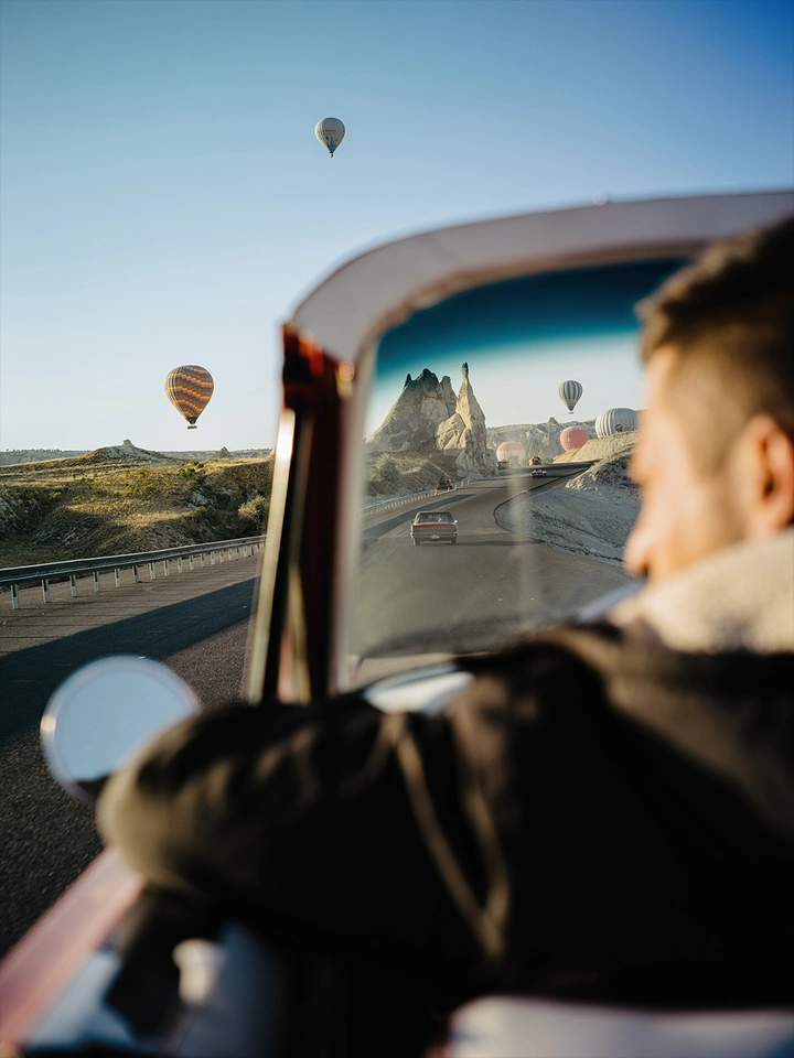 拍摄于土耳其卡帕多奇亚,小哥哥似乎已经对这番景象感到审美疲劳,但漫天的热气球和复古的老爷车搭配火山岩形成的丘林地形仍然对游客们有些致命的诱惑,车内视角永远是电影感最直接的来源。