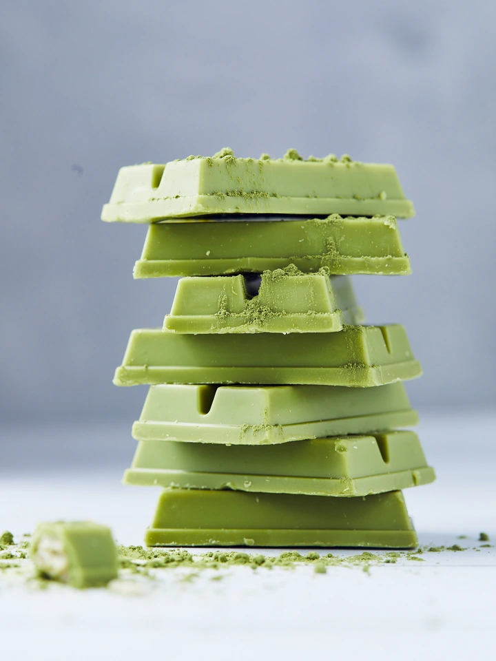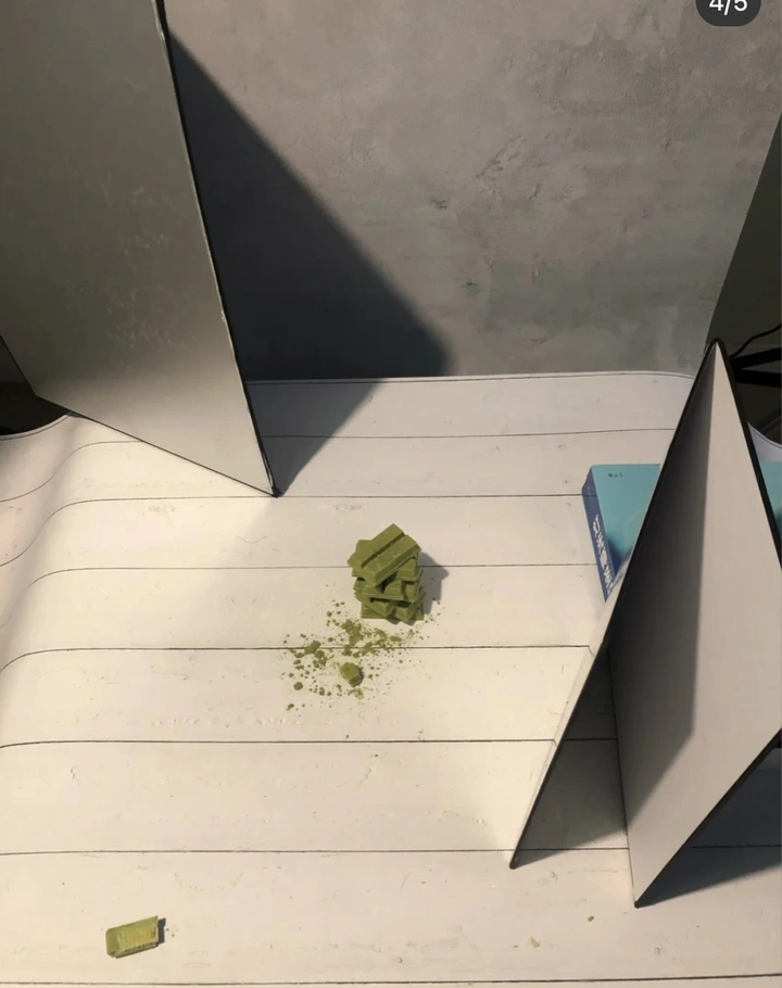 这次拍的这款抹茶巧克力饼干,外观是绿色呈长条形。如果找个盘子直接摆进去会感觉可能有点无趣,于是我把这些饼干像堆积木一样叠放起来,并且每一排都刻意保持不同朝向,一方面从多个角度展现饼干主体外观,另一方面这种层叠结构又自然产生了丰富的光影变化,空间感十足。