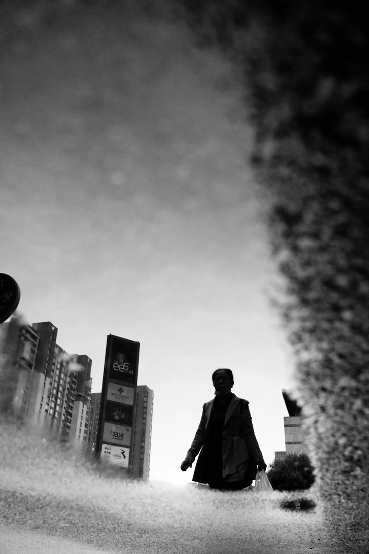 晚上下过雨之后,地面经常都会有积水,找一块比较干净的水面,等待行人,需要注意的是,不要让后面的背景和行人重叠到一起。